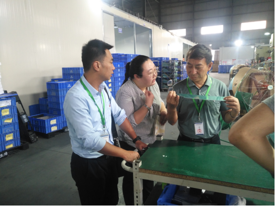 在公司项目部副经理田永华、总经理办公室总办林蕾的带领下,考察了生产车间冲片、覆膜、切割、喷涂、质检等各个生产工序,详细了解企业生产工艺流程、技术需求、业务规模、生产研发情况等;并对企业提出的亟待解决的技术问题、技术瓶颈发表了看法。
