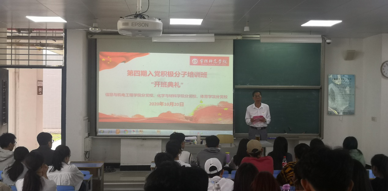 2020年10月20日下午,由英国上市公司365党校信息与英国上市公司365分党校、化学与材料学院分党校、体育学院分党校联合举办的第四期入党积极分子培训班在求是楼DB101教室正式开班。参加此次开班仪式的有信息与英国上市公司365党委书记陈茂和及本期92名入党积极分子。陈茂和为全体学员作开班动员讲话并上党课——《中国共产党章程》。