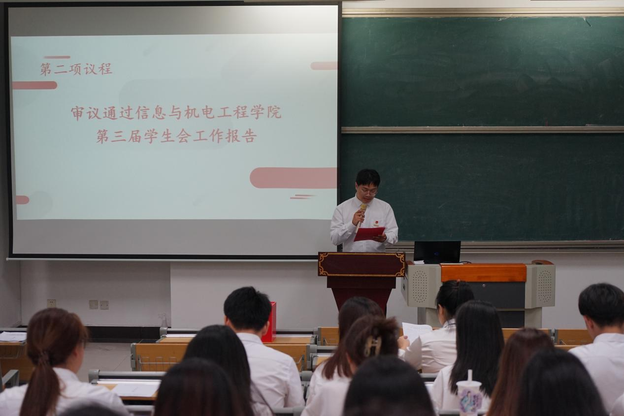 会议在雄壮的国歌声拉开序幕,学生代表听取我院学生会主席团成员陈炜文做的题为《初心如磐谱新篇,恒心永驻续华章》的工作报告,陈炜文同学详细介绍了学院学生会在过去一年的工作和对新一年工作的展望;他号召全院学生干部要更加深入学习贯彻习近平新时代中国特色社会主义思想,厚植家国情怀,涵养进取品格,以奋斗姿态激扬青春,不负时代,不负华年。工作报告获得了参会代表的一致通过。